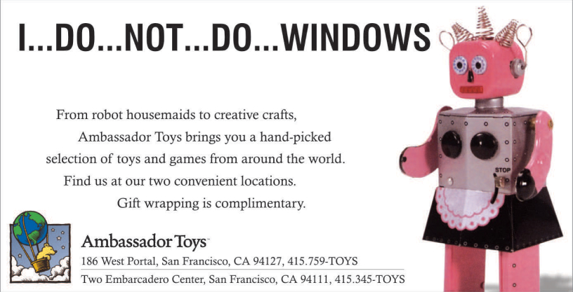 Readers of the San Francisco Chronicle found these ads so enjoyable that they looked forward to the new creative every time the weekly ad was published on Tuesday mornings.
