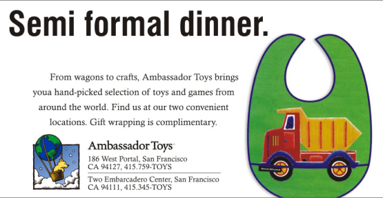 Readers of the San Francisco Chronicle found these ads so enjoyable that they looked forward to the new creative every time the weekly ad was published on Tuesday mornings.